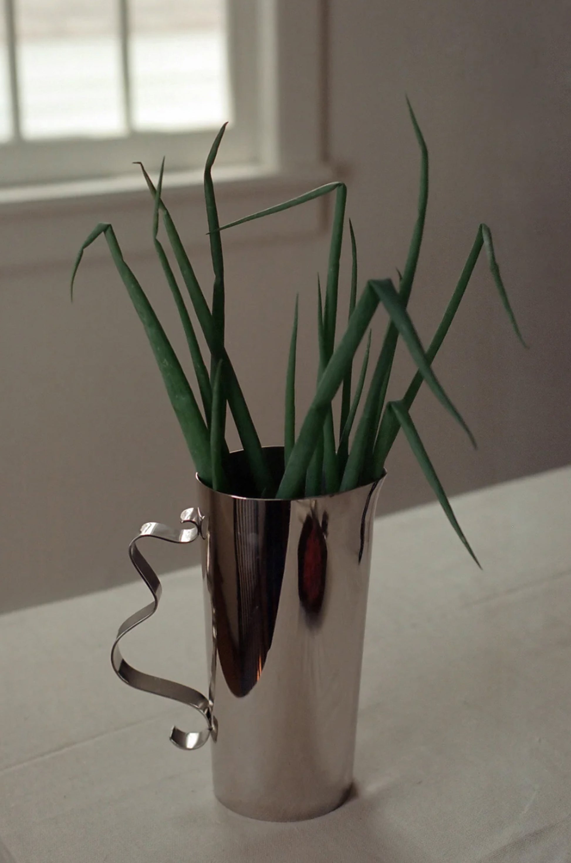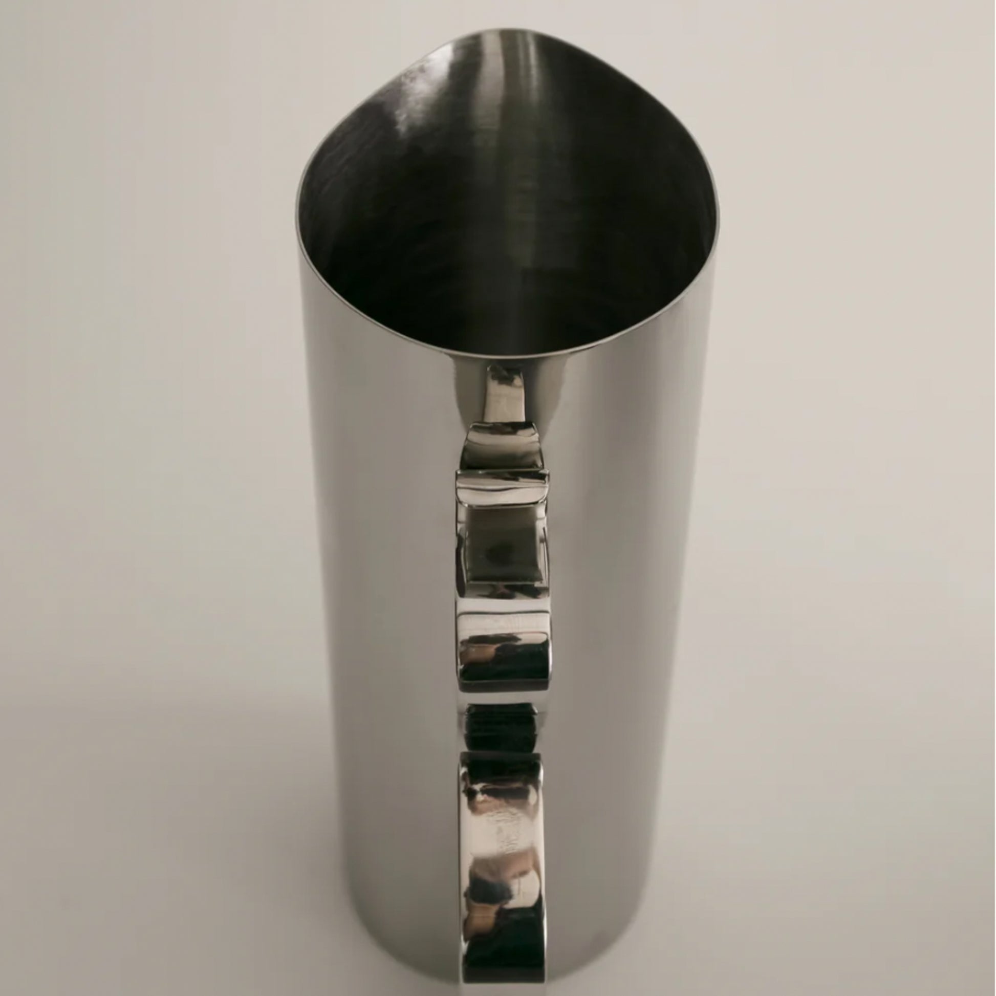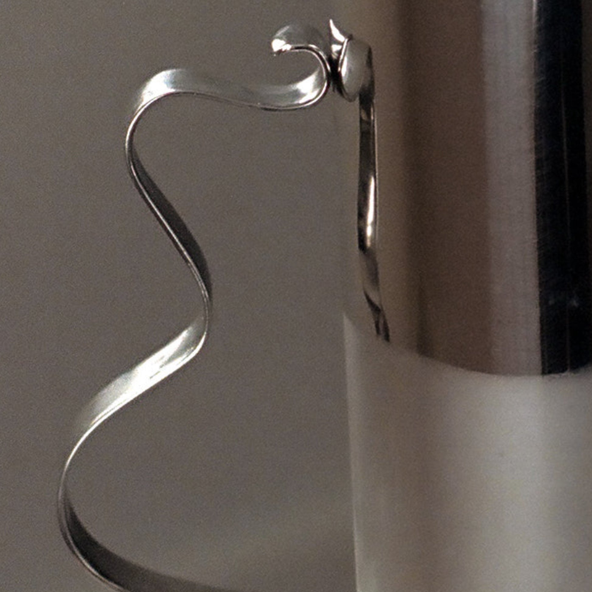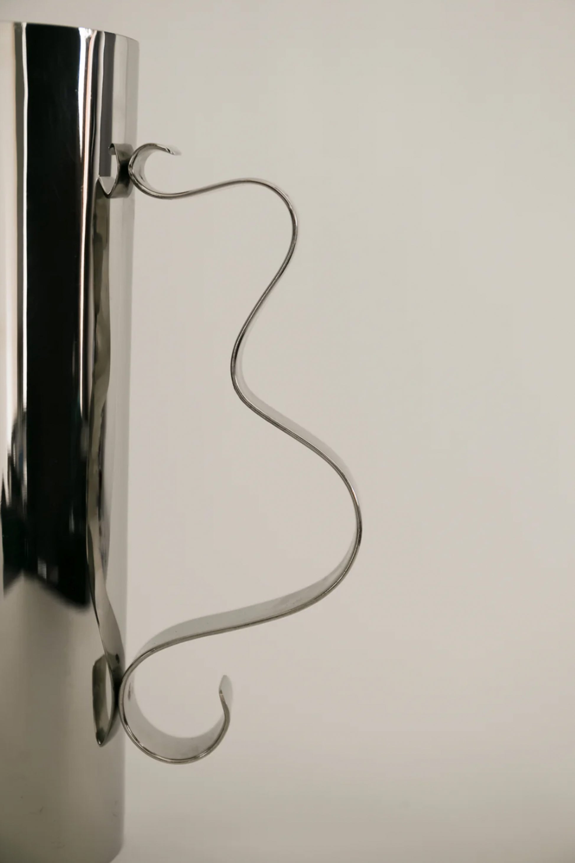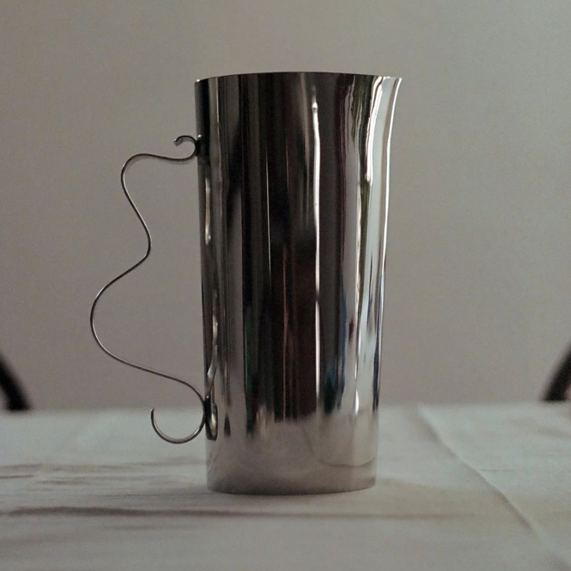 A mirror polished stainless steel pitcher with a soft, wavy, ribbon-like handle. This pitcher is ideal for serving drinks, coffee or tea, or simply as a decorative vase. Pairs beautifully with its sister Squiggle Tray.