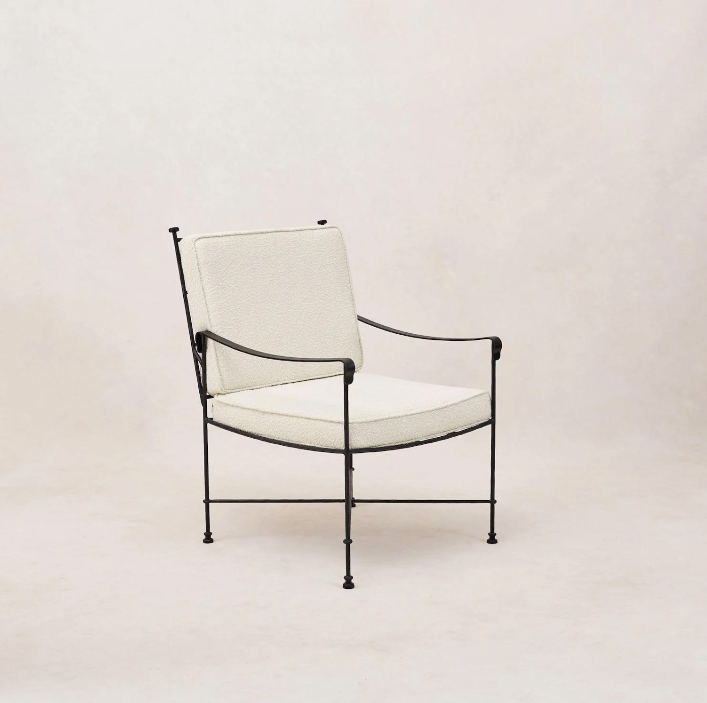 Crafted with a thin handmade iron frame, its durable construction and timeless design can be enjoyed for years to come. The plush outdoor boucle is completely weather-proof, ensuring lasting comfort and elegance. But what truly sets this chair apart is its unique design - the frame was thoughtfully designed to stand beautifully on its own during the off season when cushions are tucked away for safe-keeping.