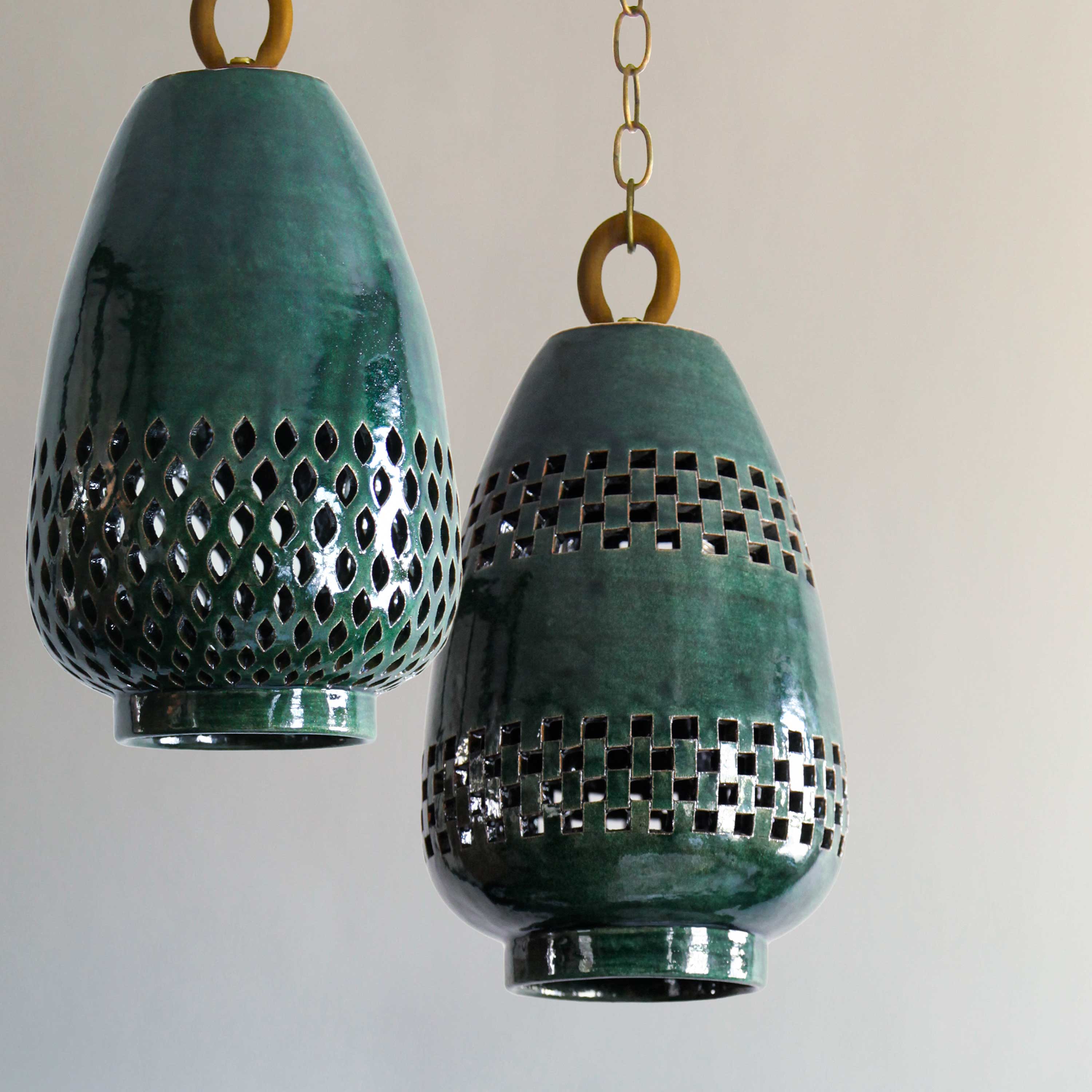 Using a red clay that comes from local mountains, the pendant lights in this collection are first given form within custom gesso molds. Emerging from the molds, the repeating openwork designs—which play on motifs that are carved in to the stone at Mitla, the neighboring archeological ruins—are meticulously cut out one by one. Each piece is then treated with a finish before entering into a final kiln firing.