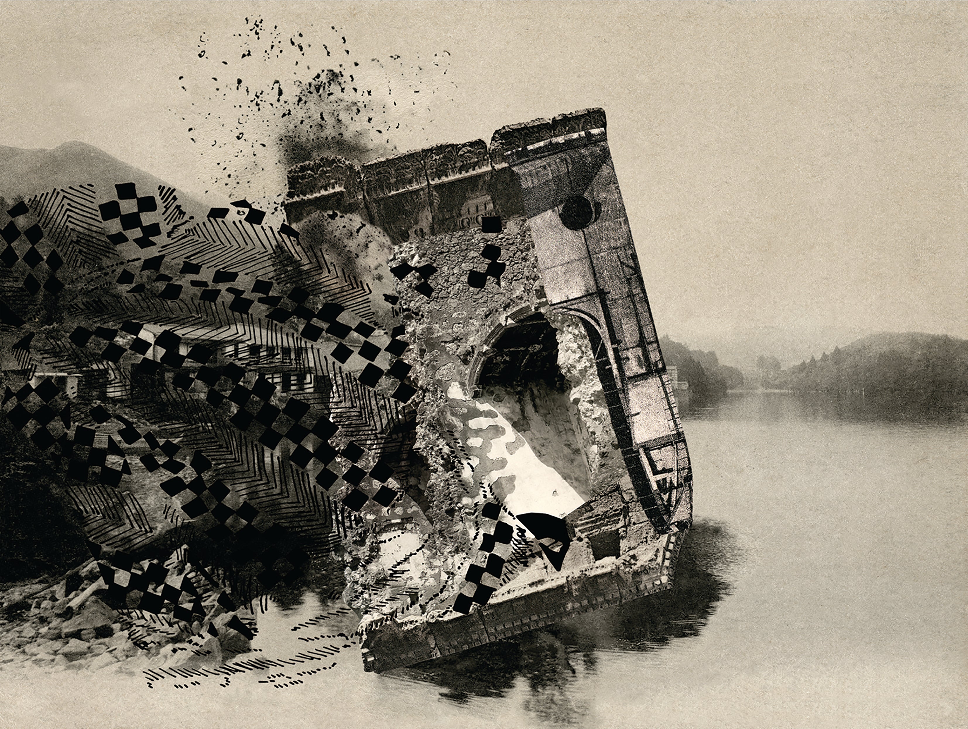 These works focus on the combination and fusion of the past and present, the near and the far, the natural and the human, intertwining what is other and what is one's self. In all of them, Franchy re-examines the images and texts of the archive, repeating them, reproducing them and reprinting them, while juxtaposing and complicating the relationships of localities, architectures and landscapes with which she identifies, as well as of time, creating new and strange topographies always animated by a sort of precarious balance, quasi-apocalyptic and dense, even when transparent and dispersed; a signifying framework giving shape to a physical as well as mental construction.