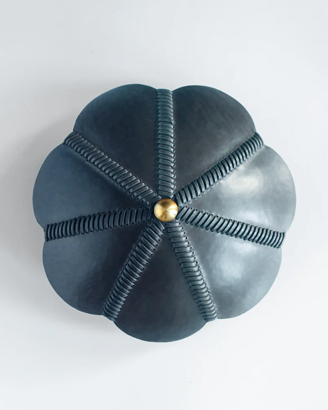Each lamp is crafted from natural grain board-formed leather, guided by the same formation techniques as those used in fashioning saddles, with curves reminiscent of the figures in Botero’s paintings.