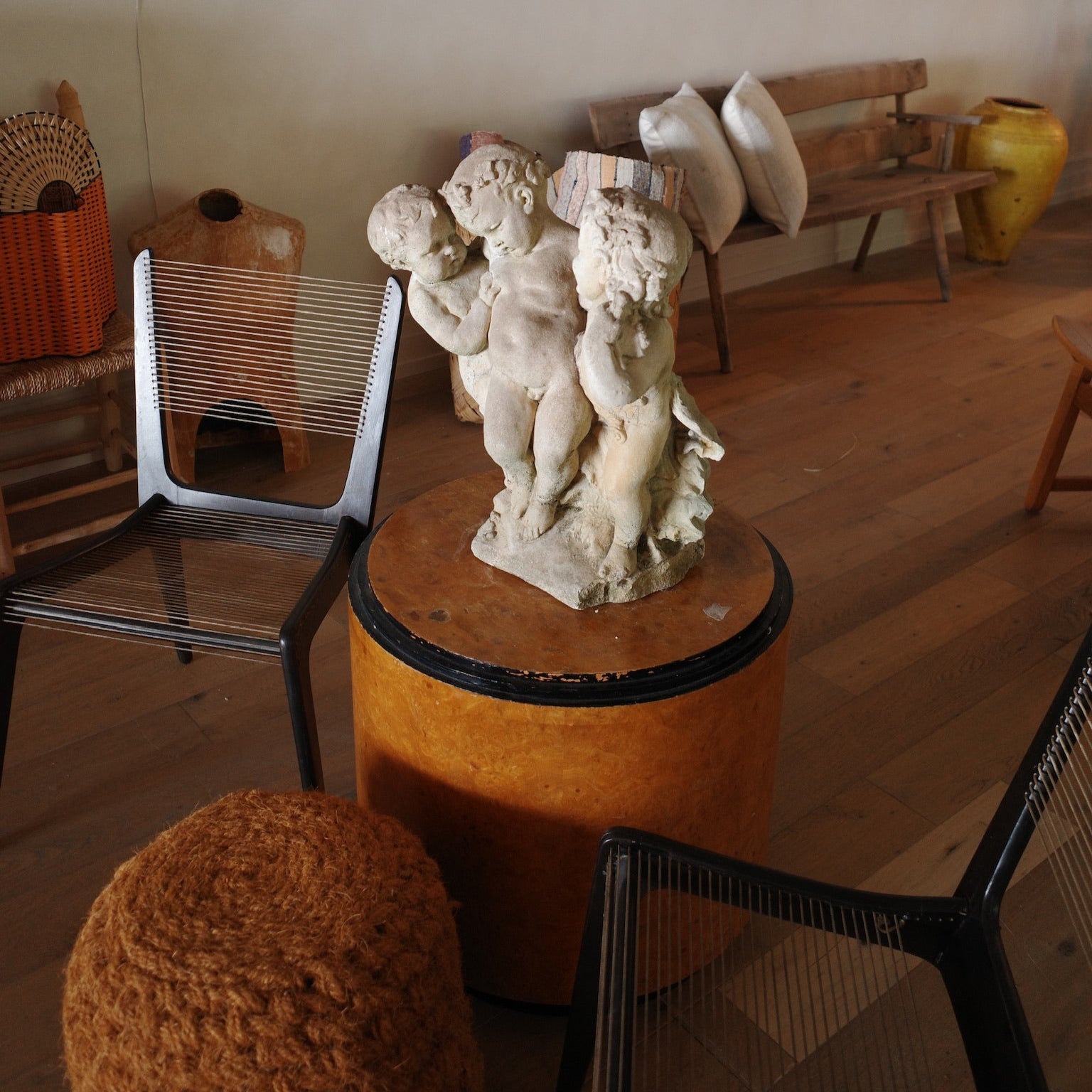 Vintage stone cast sculpture depicting playful Bacchic figures in relief. Attributed to Benoît Rougelet, with rich classical detail and timeless character.