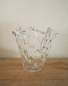 A sculptural glass vase from the mid-century Nordic tradition, featuring an organic, wave-like form with textural ridges and fluid contours. Its clear finish captures and refracts light, offering a quiet yet dynamic presence on any surface.